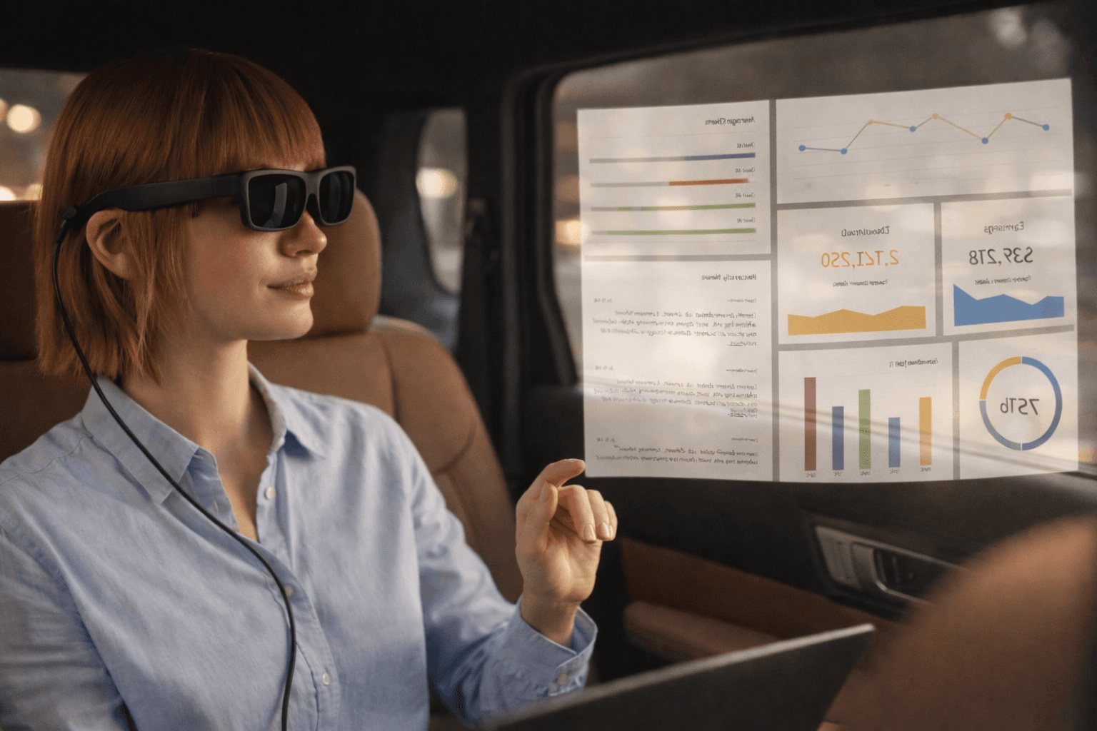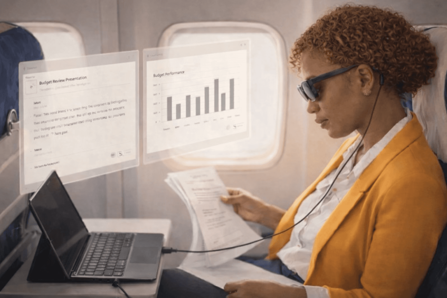 Small table, cramped seat, no monitor? None of that matters anymore. Your full workspace lives in your glasses.